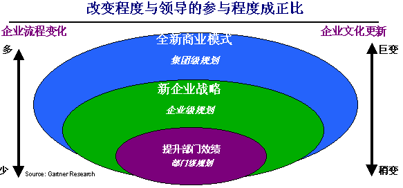 成功實施CRM的第一個關(guān)鍵是贏得企業(yè)的高層支持。高層支持的項目,或稱“一把手”工程,往往能夠推行得比較順利。在我們的實施中,最經(jīng)常項目牽頭人是客戶方負責(zé)運營的老總或總經(jīng)理。企業(yè)要應(yīng)用CRM系統(tǒng),不應(yīng)當(dāng)僅僅是信息部門或銷售部門內(nèi)部的事情,而應(yīng)當(dāng)是整個企業(yè)在高層領(lǐng)導(dǎo)的直接參與指導(dǎo)之下的多方協(xié)同調(diào)整,因為CRM涉及的是市場、銷售、服務(wù)等多個與客戶打交道的部門和流程。企業(yè)內(nèi)部的高層管理者必須承擔(dān)起項目負責(zé)人的角色,才能讓CRM實施順利地開展,才能完成部門之間的協(xié)同,才能實現(xiàn)企業(yè)內(nèi)部的文化轉(zhuǎn)變。高層參與的程度可以由下面的圖示說明: