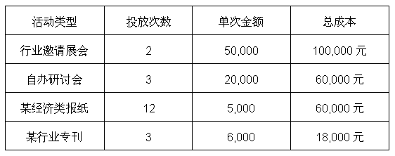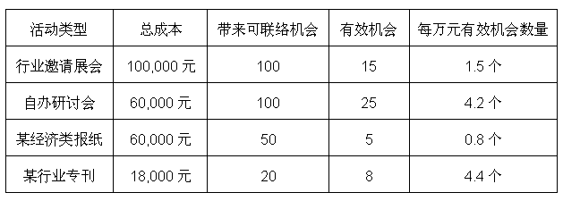 從前面的分析中,我們?cè)?jīng)談到過:市場(chǎng)的核心是用最低的成本,幫助企業(yè)把目標(biāo)客戶推動(dòng)成為機(jī)會(huì)客戶。那么,同樣成本推動(dòng)為有效機(jī)會(huì)客戶數(shù)量的多少,則是評(píng)價(jià)市場(chǎng)方案的有效模型。當(dāng)然,針對(duì)個(gè)人消費(fèi)市場(chǎng),似乎可以用更加簡(jiǎn)單的投入產(chǎn)出比進(jìn)行分析,一種類型的市場(chǎng)投放運(yùn)作,在一定時(shí)間內(nèi)帶來的業(yè)績收益與成本的比較,可以方便地了解到不同類型市場(chǎng)投放的效益對(duì)比;而對(duì)于大部分需要有銷售過程的機(jī)構(gòu)消費(fèi)客戶,我們可以參考以下我們對(duì)劉總公司拿出的模型示例: