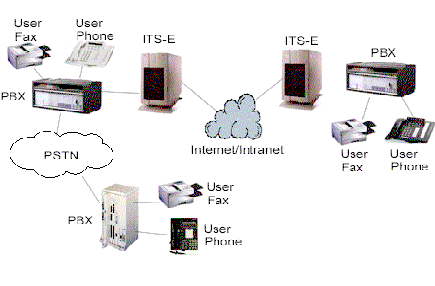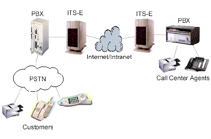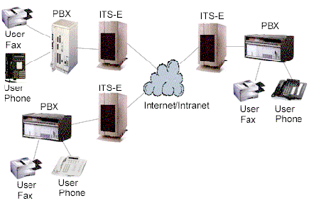 許多公司有多個辦公地點(diǎn),各地之間有著頻繁的通訊往來,電話和傳真。典型地,通訊涉及到公用交換電話網(wǎng)(PSTN)或PBX間的私人連接路線。Internet電話服務(wù)器(ITS-E)提供了另一選擇;驹硎且惶幱脩魮艽虻碾娫捊(jīng)本地PBX路由到本地ITS-E,本地ITS-E通過IP網(wǎng)絡(luò)送到目的地ITS-E,目的地ITS-E再將電話送到目的地PBX上,最后送到目的地電話或傳真機(jī)上。