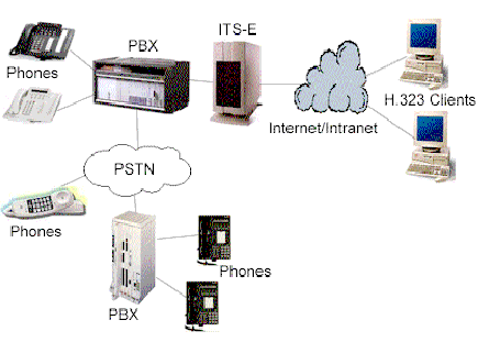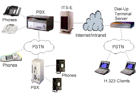 計(jì)算機(jī)IP電話產(chǎn)品,類似網(wǎng)絡(luò)會議系統(tǒng),允許用戶使用他們當(dāng)前的IP聯(lián)接把通話接到電腦上去(如通過以太網(wǎng)聯(lián)接到他們的局域網(wǎng)中)。這種作法的局限是PC用戶只可以與另一PC用戶通話。然而,使用ITS-E,這種局限將不存在。任何在網(wǎng)絡(luò)上的PC可使用H.323(用于IP電話上的ITU-T標(biāo)準(zhǔn))軟件包來實(shí)現(xiàn)通話,如微軟的網(wǎng)絡(luò)會議系統(tǒng),通過ITS-E服務(wù)器通至一個常規(guī)的電話使用者。電話用戶不需要任何新的裝備,甚至不會意識到聲音是從PC機(jī)中傳出及在IP網(wǎng)絡(luò)中傳輸。示意圖如下: