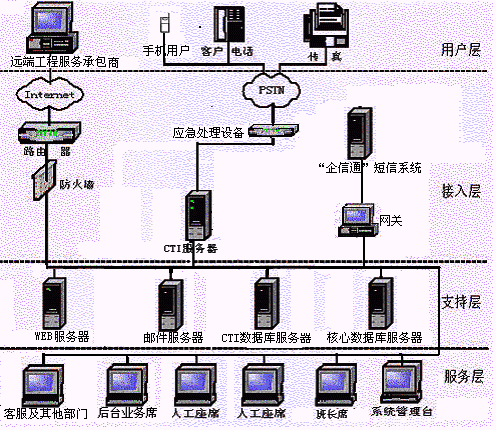 寬帶信息公司目前已建立了完善的客戶資料管理體系,能夠受理客戶客戶的業(yè)務受理、咨詢、投訴建議等,并有自己的郵件服務器和"企信通"短信服務器,因此,應當充分利用公司已有的系統(tǒng)設備,綜合公司實際的業(yè)務管理需要,客戶服務中心的熱線系統(tǒng)采用C/S三層體系結(jié)構(gòu),而后臺、客戶服務部門及其他部門之間的采用B/S體系結(jié)構(gòu),實現(xiàn)投訴事件在公司內(nèi)部各部門的傳遞、跟蹤管理,從而整合公司各部門資源為用戶及時周到的提供全程服務。