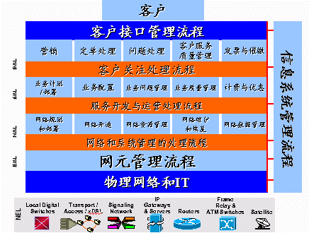 Assurance)的定義是,提供量化的測量指標(biāo),確保網(wǎng)絡(luò)服務(wù)能夠達(dá)到客戶所訂購的要求。(Service Usage)的定義是,測量電信網(wǎng)絡(luò)中各種業(yè)務(wù)的使用情況,計算處理使用電信業(yè)務(wù)的應(yīng)收費用,并對電信業(yè)務(wù)的收費過程提供支持。這是從縱向的角度來看,而從橫向的角度來看,從電信管理的角度來看,OSS主要處在三個管理層面:客戶服務(wù)層;業(yè)務(wù)管理層;網(wǎng)絡(luò)管理層。