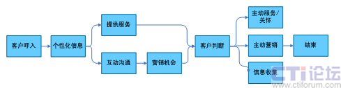 在上面的流程中,將一次客戶接觸,轉(zhuǎn)變?yōu)橐淮稳娴目蛻艋?dòng)機(jī)會(huì),通過對(duì)客戶信息360度的洞察和客戶的互動(dòng)溝通,在為客戶提供基本服務(wù)的同時(shí),根據(jù)客戶的基本資料、歷史消費(fèi)數(shù)據(jù)等,挖掘客戶的隱性需求,從而有選擇的開展客戶關(guān)懷、客戶信息收集、客戶維系、主動(dòng)營(yíng)銷活動(dòng)。下面以一個(gè)電信運(yùn)營(yíng)商的客戶呼入流程為例,說明在一個(gè)以客戶為中心的客戶接觸流程中,坐席代表可以開展的客戶接觸活動(dòng)(圖4)。