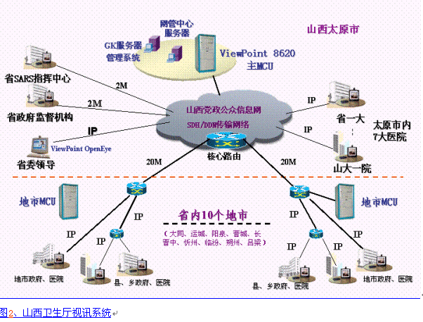 8000綜合視訊系統(tǒng),主會場設在非典防治指揮中心,利用現(xiàn)有的山西黨政公眾信息網(wǎng)絡及通信部門緊急支援的2Mbps數(shù)據(jù)專線,整個系統(tǒng)采用H.323協(xié)議,在省內(nèi)7大醫(yī)院、及省政府有關部門使用ViewPoint
