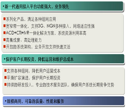 根據(jù)證券行業(yè)的特點,華為提供量身定制的證券業(yè)多媒體聯(lián)絡(luò)中心一體化解決方案。作為與客戶有效溝通交互的平臺,華為多媒體聯(lián)絡(luò)中心結(jié)合了電話、傳真、Email、Web和VoIP等現(xiàn)代通信手段,是實現(xiàn)客戶服務(wù)、銷售及市場推廣等多種目的的高效溝通渠道;谟嬎銠C(jī)與通信集成(Computer