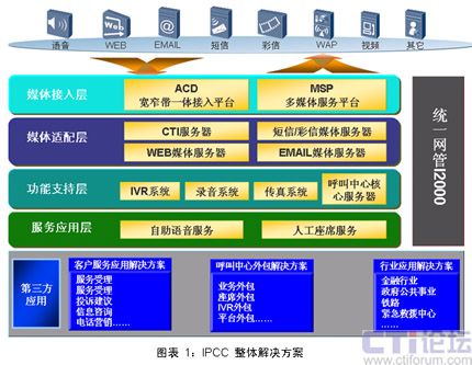 IPCC(IP聯(lián)絡(luò)中心IP Contact center)是針對金融、政府、IT和電子商務(wù)、物流、制造、緊急救援等行業(yè)的特點,推出的一體化多媒體聯(lián)絡(luò)中心解決方案。結(jié)合電話、FAX、E-mail、Web、視頻、短信等多種通訊手段,建立客服、銷售及市場推廣的高效溝通渠道。