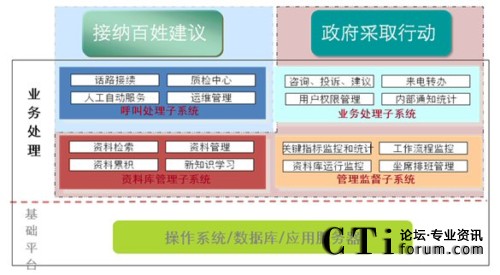 在架構設計上,從電話接入、辦件流程、資料庫管理、信息維護到報表統(tǒng)計都實現了一體化設計理念。以業(yè)務流程設計為例,針對市民來電中的咨詢類的問題,12345政府熱線將直接由前臺接聽人員利用各部門預先錄入資料庫中的規(guī)范答案來回答市民的提問;對市民反映、建議、投訴類的來電,則由前臺記錄后轉給市信訪辦的后臺工作人員處理。一整套開放性的工作流和穩(wěn)定的技術后臺支持確保了市民可以在規(guī)定的時間內得到政府的權威處理與回復。