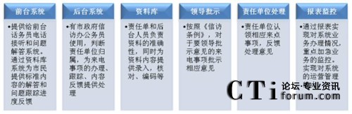 與其它政府熱線系統(tǒng)固化的功能設計不同,該方案可以靈活地定制業(yè)務模塊,方便深圳市12345公開電話系統(tǒng)根據自身市情市貌和需求,確定適合自身實際的功能組合。6組系統(tǒng)業(yè)務模塊完整地覆蓋了政府熱線的業(yè)務范圍與重點。該系統(tǒng)將政府熱線的業(yè)務分為前臺系統(tǒng)、后臺系統(tǒng)、資料庫、領導批示、責任單位處理和報表監(jiān)控等部分,貫穿了市民從咨詢、反映、投訴到建議的各個方面。為了準確反映業(yè)務狀況和系統(tǒng)運營,報表監(jiān)控模塊有力地支持了對系統(tǒng)進行運營管理工作。