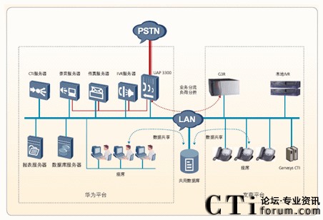 客戶電話通過PSTN統(tǒng)一由華為UAP3300排隊(duì)機(jī)接入,由華為平臺的IVR服務(wù)器進(jìn)行業(yè)務(wù)導(dǎo)航分流,根據(jù)用戶的選擇和IVR流程的配置進(jìn)行路由,可以選擇不同平臺來處理此業(yè)務(wù)。來話根據(jù)IVR流程路由后,兩個平臺采用負(fù)荷分擔(dān)方式進(jìn)行工作。在將來話導(dǎo)入兩個平臺后,采用不同設(shè)備的IVR進(jìn)行業(yè)務(wù)分配,不同平臺的座席處理不同的業(yè)務(wù)。在處理過程中,不同平臺的座席之間可以互轉(zhuǎn),達(dá)到全網(wǎng)資源共享的功能。
