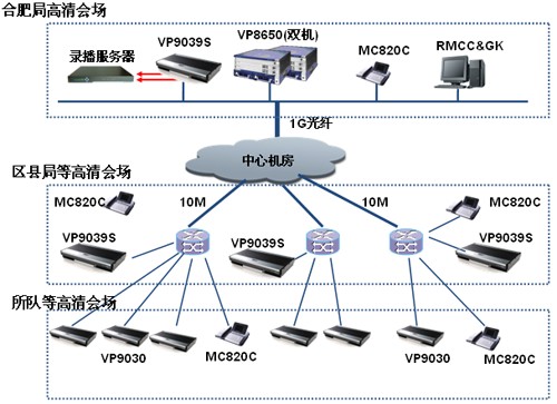 為滿足安徽省煙草合肥市公司日常工作會議、集中培訓(xùn)、遠(yuǎn)程匯報等工作業(yè)務(wù)需求,同時為應(yīng)對突發(fā)事件提供可靠可行的交互平臺,實現(xiàn)多地點、遠(yuǎn)距離的視頻、音頻和數(shù)據(jù)的互通交流。深圳市金華威數(shù)碼科技有限公司工程師建議新建的視訊系統(tǒng)采用高清的視頻會議組網(wǎng)模式,其中市局、三縣與區(qū)局、所隊及營銷部所有會場節(jié)點建設(shè)高清視頻會議系統(tǒng)。
