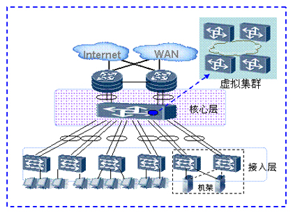 如上圖所示,整個數(shù)據(jù)中心網(wǎng)絡通過虛擬集群技術,多個核心層設備虛擬為一臺設備。通過增加核心節(jié)點,提供無阻塞的網(wǎng)絡能力,接入更多服務器。服務器的規(guī)?梢詮3000臺“無級擴展”到數(shù)萬臺。在滿足企業(yè)日益增長的業(yè)務需求的同時,并不增加網(wǎng)絡的復雜度,減少管理和維護的成本。