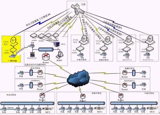 如上圖所示,本系統(tǒng)是一個由H.323和H.320組成的混合組網的視頻會議系統(tǒng),總局空管局和華北、華東、東北空管局是通過地面ATM網絡傳輸,采用的是H.323協(xié)議組網,而中南、西南、西北和新疆空管局及其下屬各個空管中心(站)采用兩種連接方式,一種是一期建設的ATM網絡,另一種是衛(wèi)星網絡,衛(wèi)星網絡采用的是H.320協(xié)議組網。其中,在H.320協(xié)議組網的系統(tǒng)中,終端又可分為雙向通訊終端和單向通訊終端,為了節(jié)約衛(wèi)星通道的租用費用,其中4條線路采用雙向通訊方式,剩下線路采用單向接收的方式。