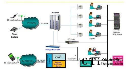 3G平臺(tái)既然可以起到這么關(guān)鍵的作用,那么如何實(shí)現(xiàn)這項(xiàng)服務(wù)呢?林克海德的產(chǎn)品可以幫助您完成平臺(tái)的搭建工作,基于背后Dialogic產(chǎn)品的全力支持,您可以實(shí)現(xiàn)web頁(yè)面到3G手機(jī)的視頻轉(zhuǎn)換,也可以與舊有的傳統(tǒng)呼叫中心(2G)互聯(lián)互通。您可以通過3G手機(jī)打到Dialogic視頻網(wǎng)關(guān),再通過3G