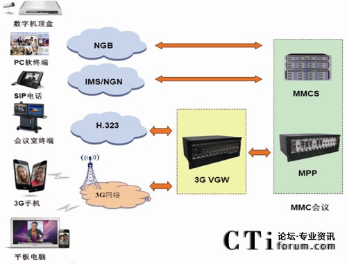 鑒于傳統(tǒng)視頻會議只能在固定地點、專用線路,通過專用設備召開語音和視頻會議的局限性。3G移動視頻會議解決方案實現(xiàn)了將會議拓展到整個互聯(lián)網(wǎng)和移動網(wǎng)絡,用戶隨時隨地可以使用3G手機和PC,通過互聯(lián)網(wǎng)、移動網(wǎng)絡即可便捷地接入到現(xiàn)有會議系統(tǒng)中,真正實現(xiàn)跨越地域、空間的全方位會議。CTI論壇編輯