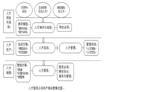作為人才與用人單位的橋梁,人才租賃公司的運營模式直接影響到人才租賃這種就業(yè)形式和用人方式的發(fā)展,也關乎整個勞動力市場的運作。人才租賃公司的生存和發(fā)展主要依靠對人才的經(jīng)營,人才雖然與普通產品具有較大差別,但對人才租賃公司來講同樣需要經(jīng)歷基本“供給—生產—銷售”等環(huán)節(jié)。具體來講,可以將人才租賃公司的供產銷運營模式用下圖表示。