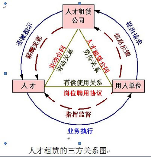 人才租賃有三方,人才租賃公司(或租賃機(jī)構(gòu)),人才(或員工)和用人單位(或企業(yè)),三方關(guān)系如下圖所示。用人單位與人才租賃公司是勞務(wù)關(guān)系:用人單位向人才租賃公司提出租賃請(qǐng)求,人才租賃公司接受請(qǐng)求,雙方簽訂租賃合同,由人才租賃公司向用人單位提供一次性或者是特定的勞動(dòng)服務(wù),用人單位定期支付人才租賃公司相關(guān)費(fèi)用,包括被租人才的工資、保險(xiǎn)和人才租賃公司的經(jīng)營(yíng)管理費(fèi)用等;人才租賃公司與人才是勞動(dòng)關(guān)系:人才租賃公司委派人才去用人單位工作,在此之前或此時(shí)雙方簽訂勞動(dòng)合同,勞動(dòng)者接受人才租賃公司的管理,從事人才租賃公司安排的工作,向人才租賃公司領(lǐng)取報(bào)酬;用人單位與人才是有償使用關(guān)系,人才到用人單位工作,并接受其管理,雙方簽訂崗位聘用協(xié)議,用人單位指揮、監(jiān)督人才進(jìn)行工作,并負(fù)責(zé)將人才的使用情況反饋給人才租賃公司,由人才租賃公司對(duì)人才進(jìn)行薪酬發(fā)放和激勵(lì)獎(jiǎng)懲。