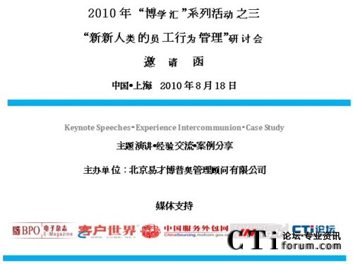 宣傳廣泛:除了易才博普奧《電子雜志》外,我們還與《呼叫中心觀察網(wǎng)》、《客戶世界》、《CTI論壇》、《中國服務外包網(wǎng)》等專業(yè)權威媒體充分合作,在會前、會后對本次大會進行廣泛宣傳和報道。