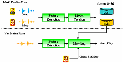 而語者驗(yàn)證(Speaker Verification)技術(shù),如下圖所示,我們亦可稱之為語者認(rèn)證(Speaker Authentication)或是語者偵測(Speaker Detection),主要是用來鑒定一已知身份的說話者其宣稱之身份的真實(shí)性,利用擷取說話者的聲紋特征,我們可以從事先儲存的語者聲紋資料庫中,取出該宣稱身份的語者聲紋模型,并且和說話者輸入的聲音做比對,由于系統(tǒng)會先獲知該使用者表明的身份(如小美),所以這會造成兩種可能的判斷錯誤,其中一種是錯誤接受(False Accept),即說話者為一冒充者(Imposter)但被系統(tǒng)誤認(rèn)為其所宣稱的身份,另外一種是錯誤拒絕(False Reject),即系統(tǒng)將真實(shí)身份的說話者誤判為冒充者。