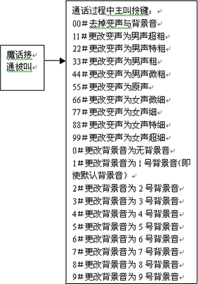 變聲通話功能也叫魔話功能,是指用戶通過(guò)通過(guò)播打特殊的號(hào)碼接入到本平臺(tái)后,再通過(guò)本平臺(tái)去呼叫最終的被叫用戶,在這樣的一個(gè)通話過(guò)程中,可以通過(guò)本平臺(tái)提供8級(jí)變聲和原聲功能:“男聲超粗、男聲特粗、男聲粗、男聲微粗、原聲、女聲微細(xì)、女聲細(xì)、女聲特細(xì)、女聲超細(xì)”。在通話過(guò)程中實(shí)時(shí)變聲,并可按鍵選擇改變變聲系數(shù)或恢復(fù)原聲,趣味非凡,超常體驗(yàn)。