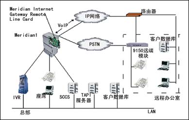 采用北電網(wǎng)絡(luò)的RemoteOffice解決方案。對于主叫用戶,與原來的撥號(hào)方案完全一樣;對于話務(wù)員座席,只是將交換機(jī)的數(shù)字座席通過廣域網(wǎng)或者專線方式連到遠(yuǎn)端。該方案在呼叫中心的PBX上安裝北電的Meridian