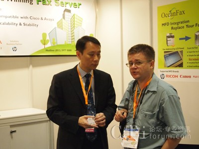 圖:傲訊全通CEO謝昭興先生(左)向來(lái)訪買家介紹OceanFax傳真服務(wù)器的最新功能