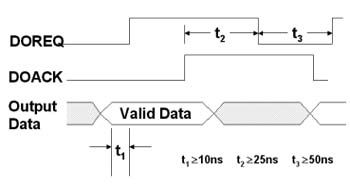 mode),相較于序列式的數(shù)據(jù)傳輸,并行傳輸提供了簡單且更高速的數(shù)據(jù)傳輸方式,不過其技術(shù)關(guān)鍵在于發(fā)送端與接收端之間的時(shí)序差問題,因此,針對此時(shí)序差的問題,高速數(shù)字I/O卡需提供握手模式,讓兩張卡以交握信號(hào)確保數(shù)據(jù)的正確性。下圖為數(shù)據(jù)輸出的時(shí)序圖: