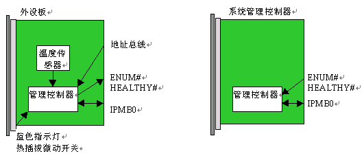 PICMG 2.9規(guī)范得到了進(jìn)一步的改善,增補(bǔ)了一份變更通知,解決了最初2.9規(guī)范中的一些缺陷。ECR致力于定義一種就軟件來說與硬件無關(guān)的機(jī)制,這種機(jī)制能判別背板的容量以及哪個槽位已經(jīng)插入了CompactPCI單板。位于一個標(biāo)準(zhǔn)CompactPCI單板上的管理控制器可能會和地址總線、位于單板把手上熱插拔微動開關(guān)、藍(lán)色的熱插拔燈、甚至是HEALTHY和ENUM#信號聯(lián)通。典型的系統(tǒng)管理控制器板與位于外設(shè)板上的管理控制器的聯(lián)接如下圖3所示: