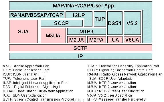 圖中粉紅色部分為SIGTRAN的協(xié)議棧,在它們之上的是對(duì)應(yīng)的電話(huà)信令協(xié)議。SIGTRAN的協(xié)議棧分為2層:一層是SCTP,它提供多個(gè)流的,可靠的數(shù)據(jù)傳輸,用戶(hù)數(shù)據(jù)的捆綁和分段,阻塞和流量控制,防止"拒絕服務(wù)"和"偽裝"的攻擊等功能。另一層是用戶(hù)適配層,圖中由SUA、M3UA、M2UA、M2PA、IUA和V5UA五個(gè)適配模塊所組成,它們分別來(lái)滿(mǎn)足各種電話(huà)信令協(xié)議適配的要求。