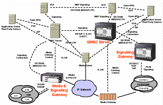 在這個(gè)例子中媒體和信令網(wǎng)關(guān)(Media & Signalling Gateway)、移動(dòng)交換中心網(wǎng)關(guān)服務(wù)器(GMSC Server)、拜訪位置寄存器(VLR)、歸宿位置寄存器(HLR)都集成了信令網(wǎng)關(guān)的功能,它們分別起到無(wú)線(xiàn)接入網(wǎng)的信令網(wǎng)關(guān)和漫游信令網(wǎng)關(guān)的作用。獨(dú)立設(shè)置的信令網(wǎng)關(guān)(Signalling