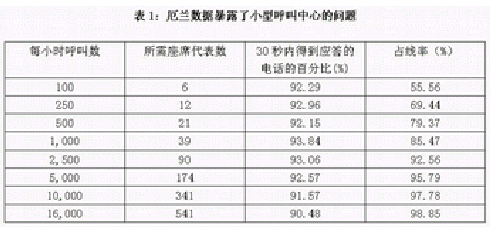 這張厄蘭表生動地說明了當(dāng)呼叫中心規(guī)模增長是其效率的迅速增長。這張表對應(yīng)的情況是這樣的:處理每一個呼叫的平均時間是2分鐘。要實現(xiàn)的目標(biāo)是90%的呼叫要在30秒內(nèi)得到應(yīng)答。第一列顯示了呼叫量的增長,第二列顯示了相對于特定的呼叫量,為達到指定的服務(wù)水平,在該厄蘭模型下所需的最少座席代表數(shù)。
