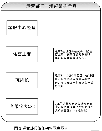 關(guān)于團隊的建設,應該首先考慮組織架構(gòu)的設立。從運營角度講,設置客服中心經(jīng)理、運營主管、班組長、客服代表都是必須的。當然根據(jù)不同的規(guī)模,也可以增加或者減少層級。具體建議請見圖2所示。除了運營之外,對于大型呼叫中心(50坐席以上,或者業(yè)務較為復雜的),也應考慮相關(guān)部門的設立。比如客戶關(guān)注組,可以負責疑難問題解決、工單流轉(zhuǎn)、投訴處理、建議處理、知識庫建設采編等等;培訓組可以負責管理、組織、實施員工培訓;技術(shù)維護組可以負責系統(tǒng)維護、網(wǎng)絡維護、新項目應用界面開發(fā)、部分系統(tǒng)優(yōu)化;綜合行政可以負責人事、行政等事務。