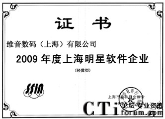 CTI論壇(ctiforum)10月19日消息: 金秋十月,捷報(bào)頻傳,由上海市軟件行業(yè)協(xié)會(huì)開(kāi)展的2009年度上海明星軟件企業(yè)評(píng)選結(jié)果出爐,維音數(shù)碼不僅榮登:“2009年度上海明星軟件企業(yè)(經(jīng)營(yíng)型)”和“2009年度上海明星軟件企業(yè)(創(chuàng)新型)”獲獎(jiǎng)榜單,維音數(shù)碼自主研發(fā)的軟件產(chǎn)品VisionCTI(計(jì)算機(jī)電話集成系統(tǒng))更是被評(píng)定為“2009年度上海市優(yōu)秀軟件產(chǎn)品獎(jiǎng)”。