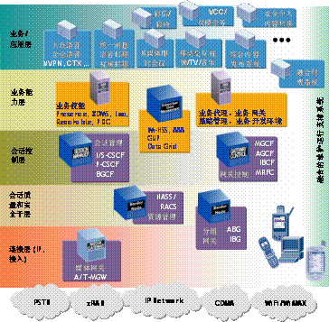 阿爾卡特朗訊會(huì)話管理實(shí)現(xiàn)IMS的P-CSCF、I/S-CSCF和BGCF的功能,網(wǎng)關(guān)控制包括MGCF和IBCF。會(huì)話管理支持2G/3G的GGSN、CAMD的PDSN、WLAN的PDG、固定有/無線的ABG的接入和會(huì)話處理。網(wǎng)關(guān)控制MGCF負(fù)責(zé)與傳統(tǒng)交換網(wǎng)絡(luò)PSTN和PLMN的互通,IBCF負(fù)責(zé)與VoIP網(wǎng)絡(luò)、IMS網(wǎng)絡(luò)和其他基于IP的多媒體網(wǎng)絡(luò)互通。接入網(wǎng)關(guān)控制實(shí)現(xiàn)電話仿真系統(tǒng)的功能。它控制A-MGW接入傳統(tǒng)固定終端,通過IMS的電話業(yè)務(wù)服務(wù)器提供各類電話基本業(yè)務(wù)和補(bǔ)充業(yè)務(wù)。