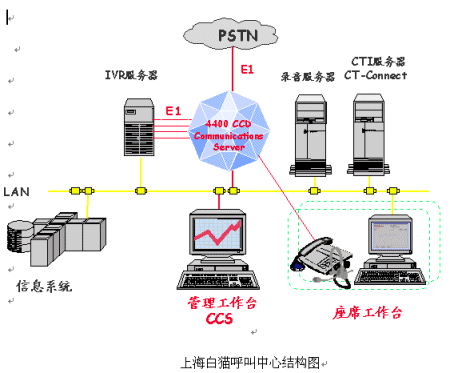 隨著企業(yè)間相互競爭的加劇,用戶對企業(yè)服務要求的提高,越來越多的企業(yè)承諾為用戶提供一個24小時的客戶服務環(huán)境,用戶可以隨時獲得聲音、文字、文件等服務。而呼叫中心可為企業(yè)解決這些問題。阿爾卡特作為著名的企業(yè)通信產(chǎn)品供應商,可以為企業(yè)提供一套完整的多媒體呼叫中心平臺解決方案。上海白貓有限公司是國內(nèi)著名的洗滌系列產(chǎn)品供應商,提供多種渠道為分銷商和用戶提供產(chǎn)品和服務。面對競爭對手,面對客戶的要求,上海白貓決定建設電子商務平臺,通過電話、傳真、郵件、網(wǎng)站各種接入手段,結(jié)合公司的物流系統(tǒng),倉庫管理,網(wǎng)站系統(tǒng),建立客戶關系管理,經(jīng)營策略分析。從而鞏固其在同行業(yè)的地位,獲得更大的競爭力。阿爾卡特為上海白貓有限公司提供OmniPCX 4400交換機解決方案。采用CCD排隊軟件,采用CCS呼叫管理軟件。CTI中間件采用CT-Connect。上海貝爾阿爾卡特公司供稿 CTI論壇編輯