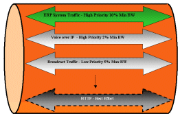 在上例中,在一個(gè)千兆端口上,為關(guān)鍵性應(yīng)用ERP預(yù)留了嚴(yán)格的10%的帶寬資源;為Voice Over IP的應(yīng)用預(yù)留了嚴(yán)格的2%的帶寬資源;為低優(yōu)先級的廣播流量預(yù)留了最大5%的帶寬資源,……….為HTTP應(yīng)用僅定義為最為普通的Best Effort。