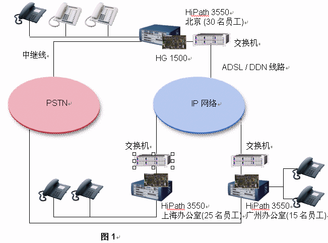 西門子推薦該公司每一個辦公室均采用HiPath 3550 PBX。如果,A公司每個辦公室已經(jīng)擁有DDN專線或ADSL連接至Internet,它就能將其內(nèi)部通信建設(shè)在現(xiàn)存的IP網(wǎng)絡(luò)的基礎(chǔ)之上。其集成網(wǎng)關(guān)HiPath 1500被用來連接數(shù)據(jù)網(wǎng)絡(luò)和語音網(wǎng)絡(luò)。在這樣的網(wǎng)絡(luò)架構(gòu)中,路由冗余能夠得到充足的保證,因為西門子HiPath解決方案提供了最大的網(wǎng)絡(luò)存活性:即使IP網(wǎng)絡(luò)出現(xiàn)故障,西門子網(wǎng)絡(luò)設(shè)置能夠?qū)⒙酚勺詣忧袚Q至PSTN之上。