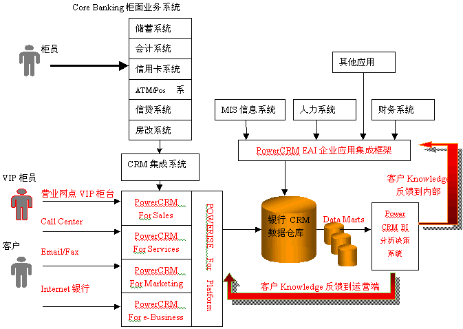 利用PowerCRM的銀行分析型CRM解決方案,對客戶信息進(jìn)行全面的分析,從而挖掘出許多客戶知識,繼而制定和改進(jìn)相應(yīng)的市場策略,應(yīng)用于PowerCRM運(yùn)營型CRM系統(tǒng)中,更好地指導(dǎo)營銷人員為客戶服務(wù)和完善客戶服務(wù)流程;同時(shí)也需要反饋到銀行內(nèi)部系統(tǒng),用于增強(qiáng)銀行內(nèi)部的運(yùn)營效率。