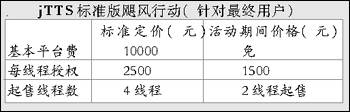 jTTS標(biāo)準(zhǔn)版在聲音質(zhì)量、聲音平滑度、自然度等方面已具有比較高的實用化水平。為了真正啟動語音技術(shù)的應(yīng)用市場,捷通華聲啟動“颶風(fēng)行動”,在活動期間為最終客戶、系統(tǒng)集成商制定了一個極具競爭力的價格,并且無平臺費。這次活動主要針對CTI領(lǐng)域中大量中小型系統(tǒng)的應(yīng)用開展此次活動,目的是讓先進的技術(shù)能夠被更多的用戶采用,為系統(tǒng)集成商應(yīng)用TTS技術(shù)提供了很高的利潤空間。