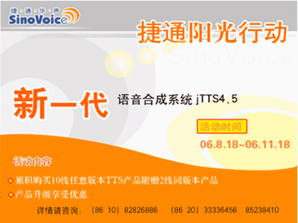 2006年8月18日,北京捷通華聲語音技術(shù)有限公司正式發(fā)布捷通華聲新一代語音合成系統(tǒng)jTTS4.5。為慶祝jTTS4.5的正式上市,同時(shí)也為回饋廣大用戶,為期三個(gè)月,推廣jTTS4.5的捷通華聲“陽光行動(dòng)”同步全面啟動(dòng)!