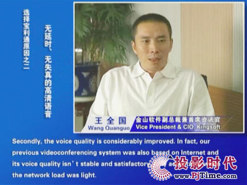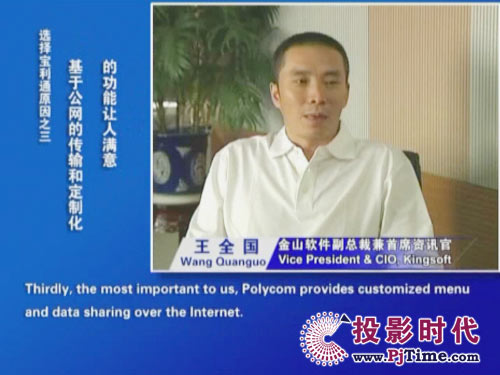 金山軟件副總裁兼首席資訊官王全國先生說道:“對于軟件行業(yè)來說,及時、高效的溝通是保持競爭優(yōu)勢的重要前提。相比之前使用的標清產(chǎn)品,寶利通高清視頻會議系統(tǒng),提供了完全不同的體驗,流暢的高清晰畫面猶如真實的面對面溝通。而且我們公司并沒有申請專線,所有的應(yīng)用都是基于公網(wǎng)實現(xiàn)的。另一方面,新型全中文定制菜單的運用,令我們使用起來非常方便,這更提高了我們使用視頻通信手段實現(xiàn)異地溝通的熱情!