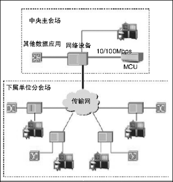 各節(jié)點(diǎn)的接入采用一條512Kbps帶寬的DDN/E1線路接入本地電信公司;在總部采用集中式接入中央電信公司,接入中心的電路帶寬應(yīng)該是多條信道捆綁的帶寬,中心節(jié)點(diǎn)交換機(jī)采用10/100Mbps與MCU相連,總部主會場的視頻終端通過接入交換機(jī)與MCU進(jìn)行通信。
