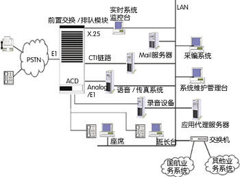 系統(tǒng)方案采用北電的Meridian11交換機作為前置交換/排隊設(shè)備, ACD功能內(nèi)置在交換機中。