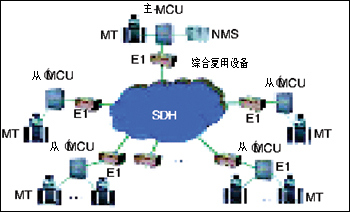 依托既有電路交換通信網(wǎng), 系統(tǒng)采用中興公司ZXMVC8200做 MCU多級(jí)級(jí)聯(lián)星型結(jié)構(gòu)組網(wǎng),其網(wǎng)絡(luò)端支持標(biāo)準(zhǔn)的E1/V.35/ISDN接口,速率為64-1920kbps,信道適應(yīng)能力強(qiáng)。每個(gè)MCU最大端口數(shù)為16個(gè),符合ITU-T