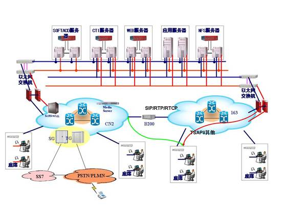 客戶座席可以分布在不同的地點,集中在電信機房的座席可以直接部署到CN2網(wǎng)上,分布在客戶處的座席,可以部署在各地市專網(wǎng)上或者163城域網(wǎng)上。部署在163網(wǎng)和專網(wǎng)上的座席,語音流和SIP協(xié)議通過寬帶接入網(wǎng)關(guān)