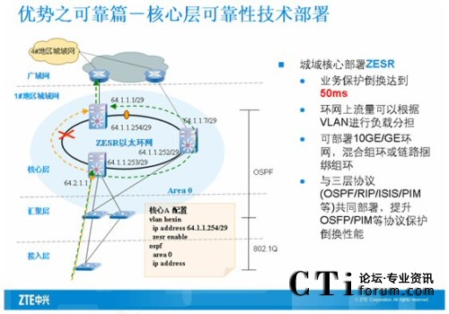 除了選型、分析各網(wǎng)絡(luò)層的設(shè)備以外,還要考慮全網(wǎng)設(shè)備的聯(lián)動(dòng)性,重點(diǎn)突出全網(wǎng)的QOS解決方案。通過(guò)與客戶的交流,發(fā)現(xiàn)客戶之所以建設(shè)這個(gè)網(wǎng)絡(luò),不僅僅是滿足辦公上網(wǎng)需求,更重要的是要保證關(guān)鍵業(yè)務(wù)的可達(dá)性和關(guān)鍵部門的連通性,因此給客戶提供一個(gè)更高的服務(wù)質(zhì)量就顯得更加重要。那么如何保證關(guān)鍵用戶的上網(wǎng)權(quán)益,關(guān)鍵業(yè)務(wù)的時(shí)時(shí)到達(dá),勢(shì)必要求我們的網(wǎng)絡(luò)要建立一整套完善的QOS服務(wù)質(zhì)量。在中興的方案中,無(wú)論是核心層的設(shè)備還是匯聚接入層的設(shè)備,都選擇了高QOS的網(wǎng)絡(luò)產(chǎn)品,能夠?yàn)橛脩籼峁┒说蕉说腝OS保證。從接入層開始,根據(jù)用戶的業(yè)務(wù),打上不同的TAG標(biāo)簽,區(qū)分不同的業(yè)務(wù)種類,交換機(jī)可以根據(jù)不同的業(yè)務(wù)種類對(duì)業(yè)務(wù)流量進(jìn)行檢索,對(duì)那些關(guān)鍵業(yè)務(wù)打上高優(yōu)先級(jí)的標(biāo)簽,保證其在整網(wǎng)的優(yōu)先轉(zhuǎn)發(fā)性。在農(nóng)機(jī)院內(nèi)部網(wǎng)絡(luò),從接入到核心、匯聚,都保持了標(biāo)簽的有效性,也就都保持了關(guān)鍵業(yè)務(wù)的優(yōu)先處理性,為武清電力通信數(shù)據(jù)網(wǎng)絡(luò)內(nèi)部提供了高QOS保證。另外為了使客戶更好的理解我們的QOS解決方案,通過(guò)膠片向其闡明了QOS的分類、QinQ的特性和SLA的特點(diǎn)。