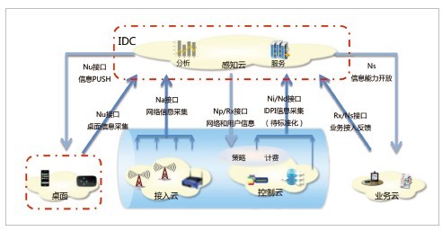 中興通訊增強端到端信息感知和開放接口,提出一套標(biāo)準(zhǔn)架構(gòu)如圖2所示,來實現(xiàn)整個網(wǎng)絡(luò)透明、可視。建設(shè)網(wǎng)絡(luò)信息采集體系,增強感知云的端到端分析能力;建立“桌面云-感知云”的云端一體化架構(gòu),提供網(wǎng)絡(luò)推送能力;感知云向終端開放網(wǎng)絡(luò)信息和能力,增強用戶感知網(wǎng)絡(luò)、定制個人體驗?zāi)芰Γ桓兄葡驑I(yè)務(wù)開放網(wǎng)絡(luò)信息和能力,拓展合作發(fā)展增值業(yè)務(wù)的能力。