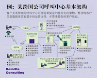 ---- 圖示是一個由德勤咨詢公司為一全球性客戶提出的呼叫中心建議,呼叫中心經(jīng)常需要這樣復(fù)雜的一個技術(shù)平臺和基礎(chǔ)支持才可能實現(xiàn)快速的來電和去電處理。