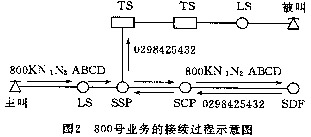 --用戶在撥打800號(hào)業(yè)務(wù)用戶號(hào)碼時(shí),首先由網(wǎng)絡(luò)點(diǎn)上的普通電話交換機(jī)接收,并把800KN1N2ABCD號(hào)碼經(jīng)話路傳送給業(yè)務(wù)交換點(diǎn)SSP,再由SSP將此號(hào)碼經(jīng)No.7信令鏈路送到業(yè)務(wù)控制點(diǎn)SCP,SCP通過(guò)在業(yè)務(wù)數(shù)據(jù)庫(kù)SDP中查尋譯碼表將此號(hào)碼翻譯成普通的電話號(hào)碼回送SSP,最后由SSP負(fù)責(zé)完成電路的連接,該過(guò)程如圖2所示。