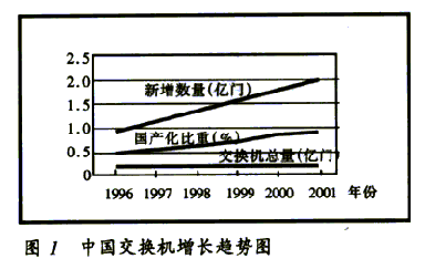2000年,中國(guó)公用通信網(wǎng)上局用程控交換機(jī)的總?cè)萘窟_(dá)到1.79億門,國(guó)內(nèi)生產(chǎn)設(shè)備的比重達(dá)80%。預(yù)計(jì)2001年新增交換機(jī)容量2100萬(wàn)門,總?cè)萘窟_(dá)到2億門,國(guó)內(nèi)生產(chǎn)設(shè)備的比重超過(guò)85%,增長(zhǎng)趨勢(shì)見圖1。