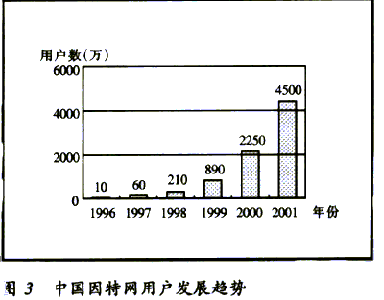 據(jù)CNNIC統(tǒng)計(jì)的數(shù)據(jù)表明,到2000年12月31日止,中國(guó)的因特網(wǎng)用戶達(dá)到2250萬(wàn)戶,上網(wǎng)計(jì)算機(jī)892萬(wàn)臺(tái),預(yù)計(jì)2001年中國(guó)將有超過(guò)4500萬(wàn)的網(wǎng)民。中國(guó)域名總數(shù)為12.2萬(wàn)個(gè),WWW站點(diǎn)數(shù)26.54萬(wàn)個(gè)。中國(guó)因特網(wǎng)的發(fā)展速度驚人,與國(guó)際因特網(wǎng)的發(fā)展速度相當(dāng)。中國(guó)因特網(wǎng)用戶發(fā)展趨勢(shì)見圖3。